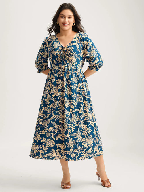 Floral Print Belted Stretchy Waist Midi Dress -